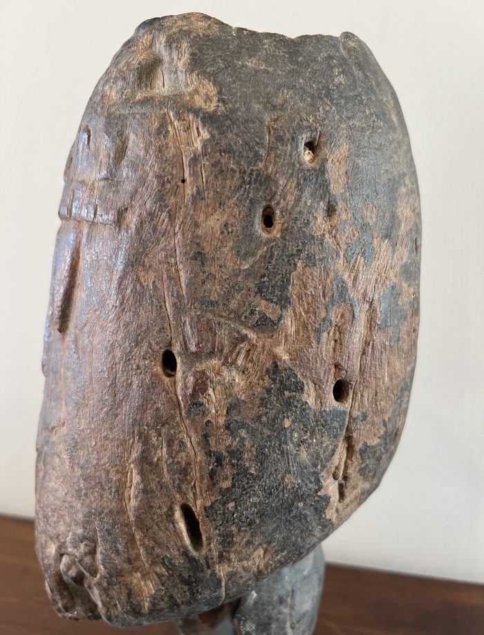 A beautifully patined Dogon head sculpture. Because of its natural wear perhaps even being more abstract and natural. As African art inspired the European modernist movement their general image became part of the collective art history reference frame. When seeing this example artist like Modigliani immediatly come to mind. But because the wood is playing out a important role in itself it seems almost to be made by nature itself.