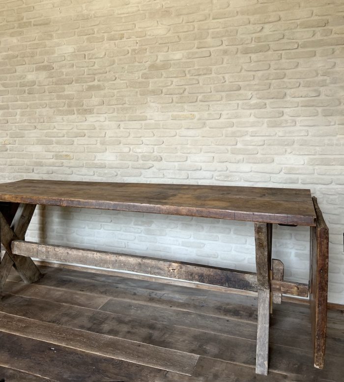 Impressive sidetable in a rural Gustavian style. Probably Sweden and beginning of the 19th century. The massive 2 plank top, unusually, cut in to 2 dropleafs (60 cm long each or 23,5") at the end wich make this table a verry versatile piece of furniture. Great patina troughout and lovely proportions. Verry sturdy and the dropleafs easily hinge up an down.