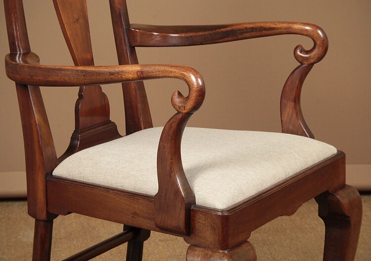 Large Victorian or early Edwardian solid mahogany open armchair of superb quality. This sturdy substantial chair has an unusual cresting rail with curving horns over a lovely shaped baluster silhouette backsplat. Graceful curving arms with crook terminals on swept supports. A large seat pad, freshly upholstered in a pale grey linen. Raised on large cabriole front legs with pad feet and, rather unusually, turned and block rear legs. Joined with turned H-stretchers plus an extra stretcher high on the rear legs for strength. Excellent condition, very comfortable and a conversation piece in its own right.