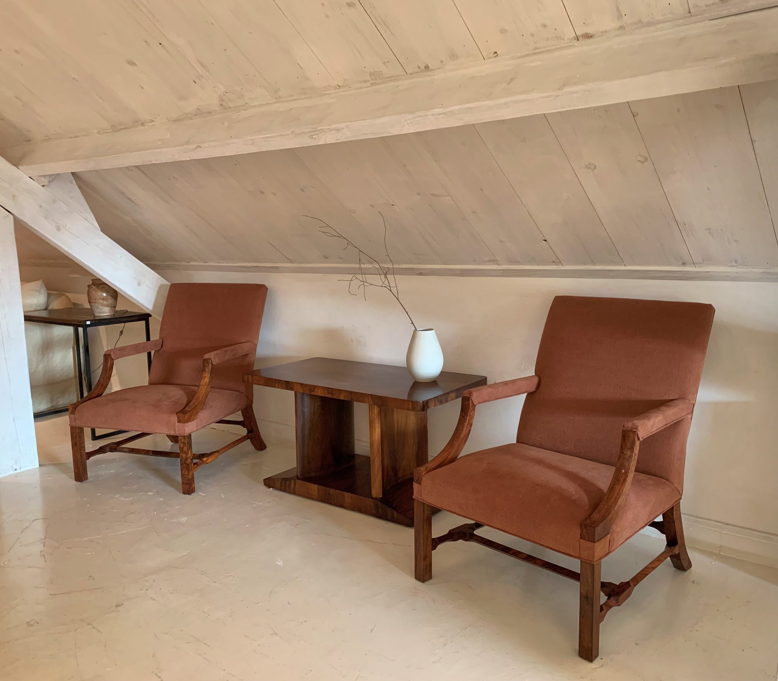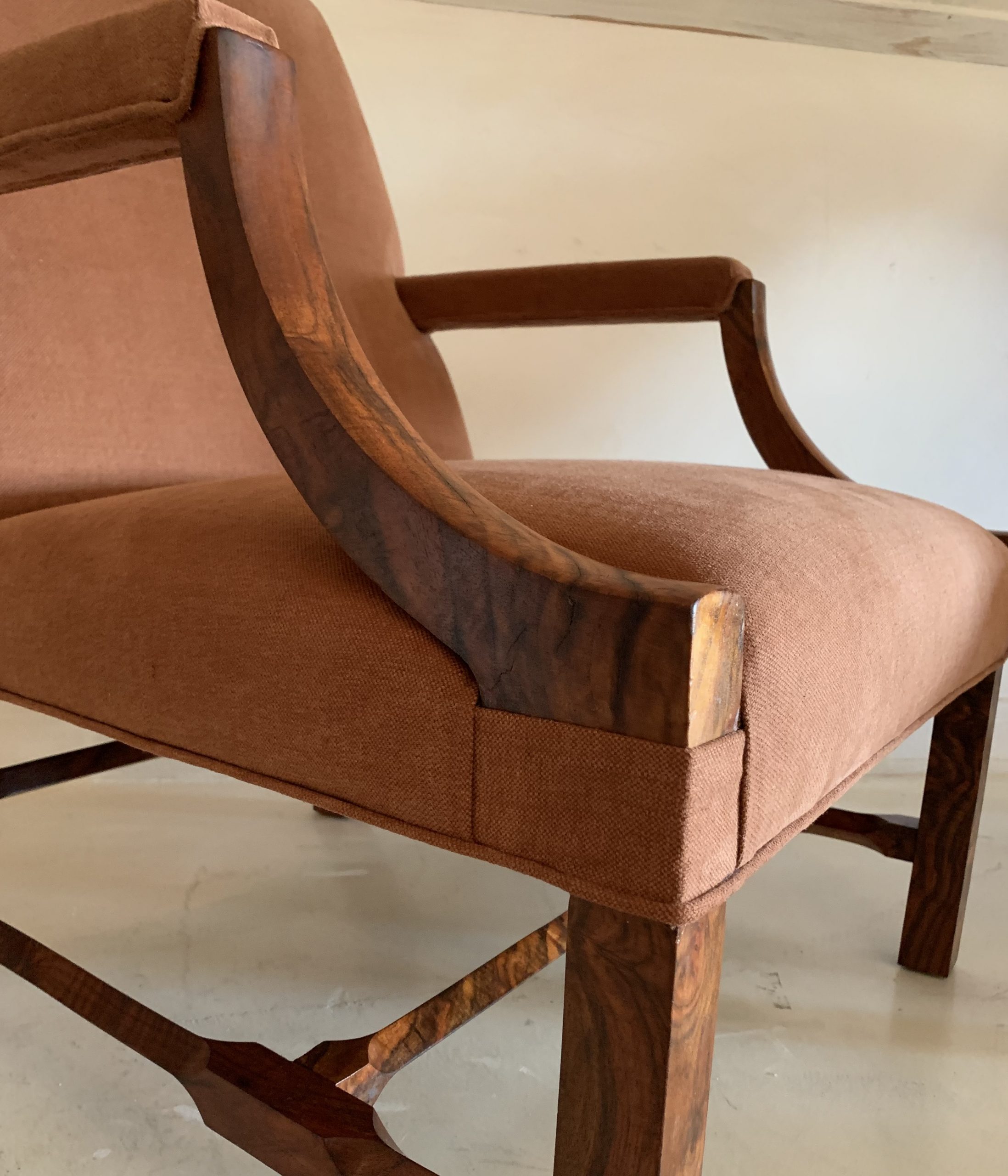 As we found a small but amazing batch of root walnut we decided to make a pair of chairs suitable for this rare woodspecies. Our choice of style was a classic high quality Gainsborough style lounge chair model. We complemented this with hand cut strectchers and a crimson colored linnen. These chairs were completely maid by hand in our workshop and is a one of pair.