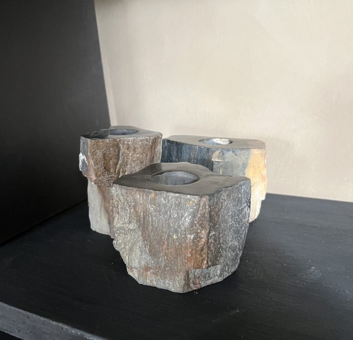 Attractive set of 3 candleholders in millenia old petrified wood. The upper surfaces polished. Circa 10 high x 8 diam, Ref. 100/item