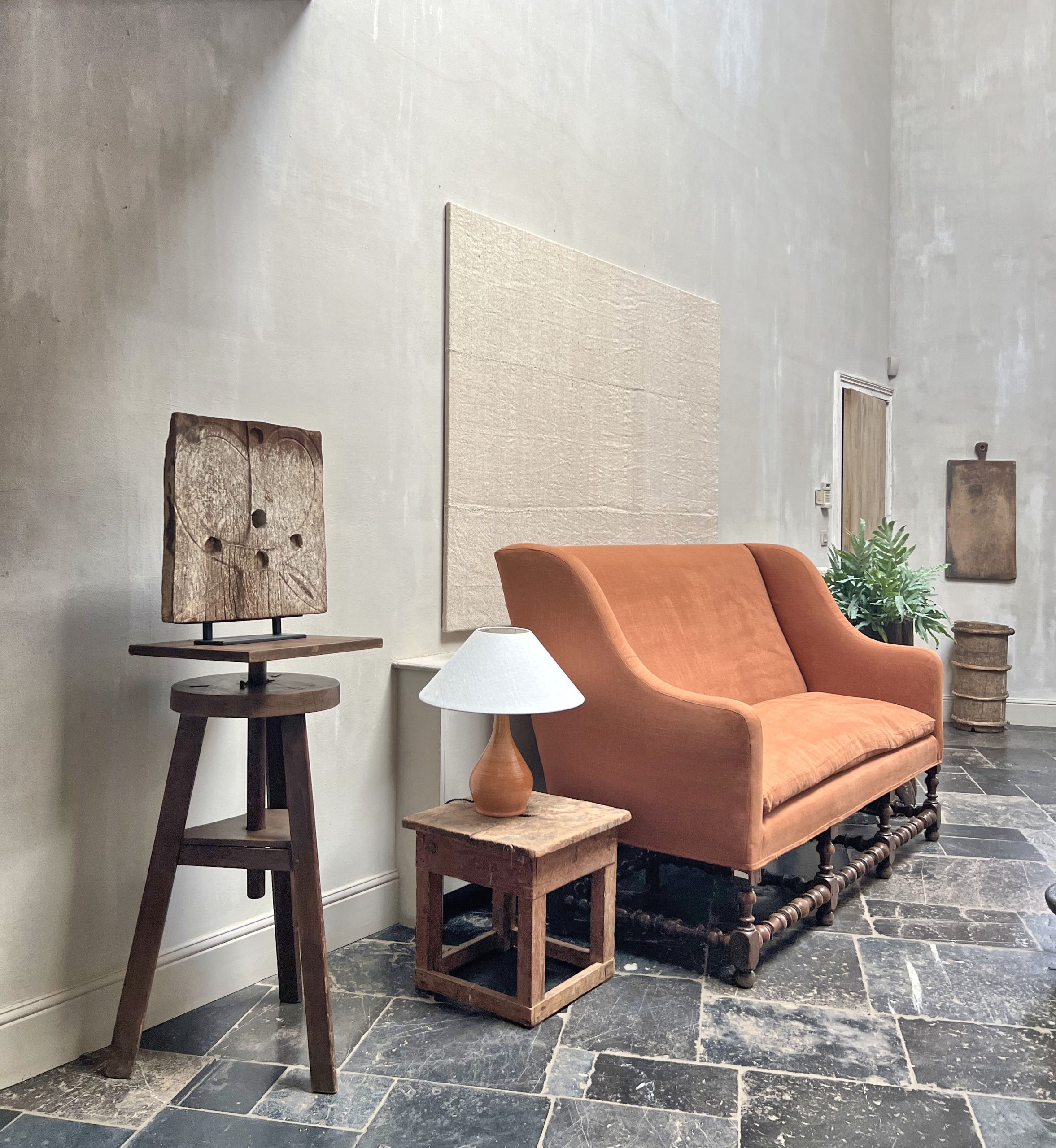 A 1970's vintage tablelamp in warm orange glazed earthenware. Refitted with electricity and new linnen hood. Lovely shape, color and proportions. 50 diam x 70 h, Ref. 1002