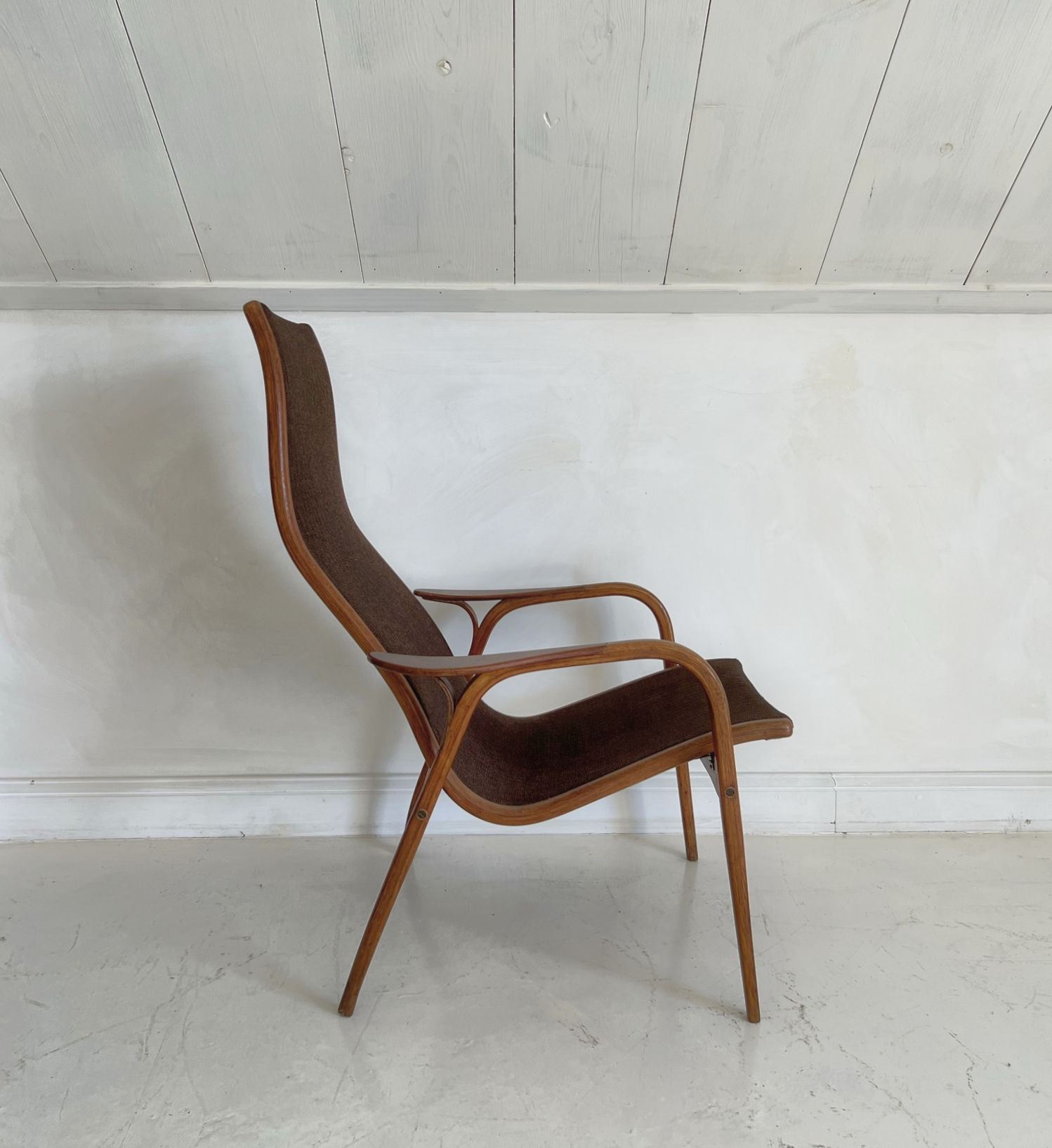 The "Lamino" easy chair is a iconic design of Yngve Ekstrom. He developed this lounge chair for Swedese as a highly comfortable chair with clean sensual lines. As this a one of the earliest series it has a beautiful hardwood frame with all the brass screws and the original wool upholstery. The wood has a subtle warm patina and the wool is verry slightly faded adding to the overall appeal.
